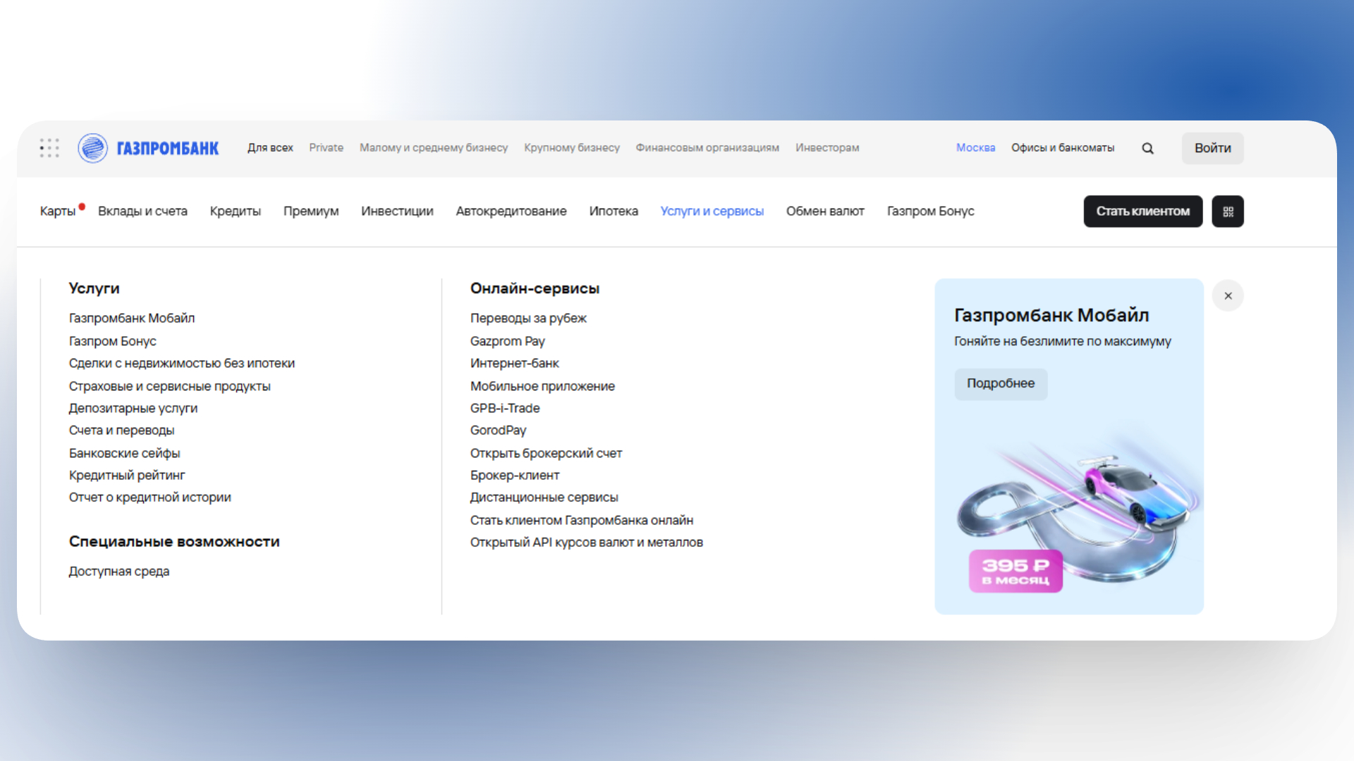 Газпромбанк предлагает один из самых широких ассортиментов финансовых продуктов на российском рынке — как для частных клиентов, так и для бизнеса любого масштаба. Частные лица могут выбрать карту с кешбэком под свой образ жизни, открыть вклад с выгодной ставкой, оформить ипотеку или начать инвестировать через мобильное приложение.